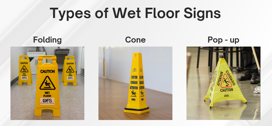 Select the Right Sign for the Situation: Choose the sign type based on the area, traffic flow, and urgency. Cone-style signs work well in busy open spaces, pop-up signs are ideal for quick deployment during unexpected hazards, and folding signs are perfect for smaller, routine spills.